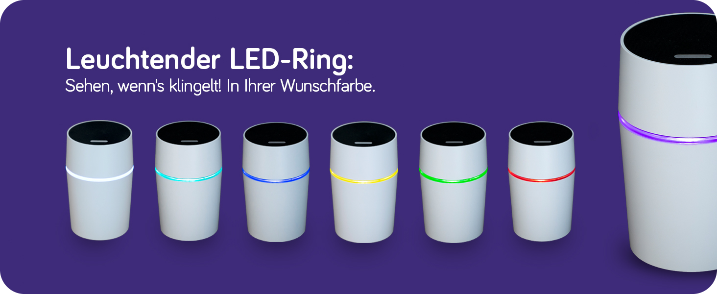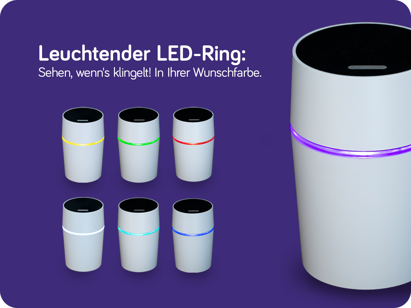 Neben akustischen Hinweisen setzt der CALIMA 800E auf starke optische Signale: Der rundumlaufende LED-Ring kann in verschiedenen Farben eingestellt werden. So übersehen Sie keinen Besucher – eine ideale Unterstützung für hörgeschädigte Personen sowie in lärmintensiven Umgebungen. Bei Bedarf sorgt das zuschaltbare Blitzlicht für noch mehr Aufmerksamkeit und Sicherheit.