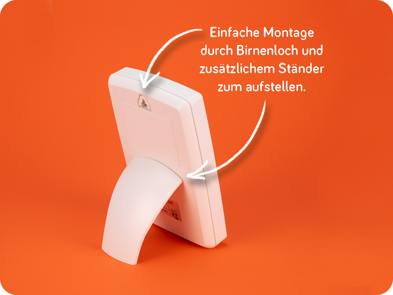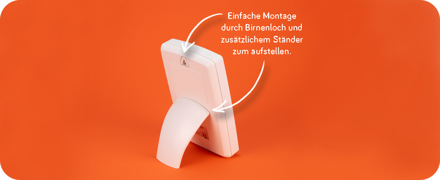 Der Empfänger ist portabel nutzbar oder kann an der Wand montiert werden – etwa im Flur, neben dem Arbeitsplatz, im Hobbyraum oder sogar im Wintergarten. Mit dem aufsteckbaren Aufsteller positionieren Sie den Funkgong ganz einfach auf einer beliebigen Fläche, ohne Spuren an den Wänden zu hinterlassen.